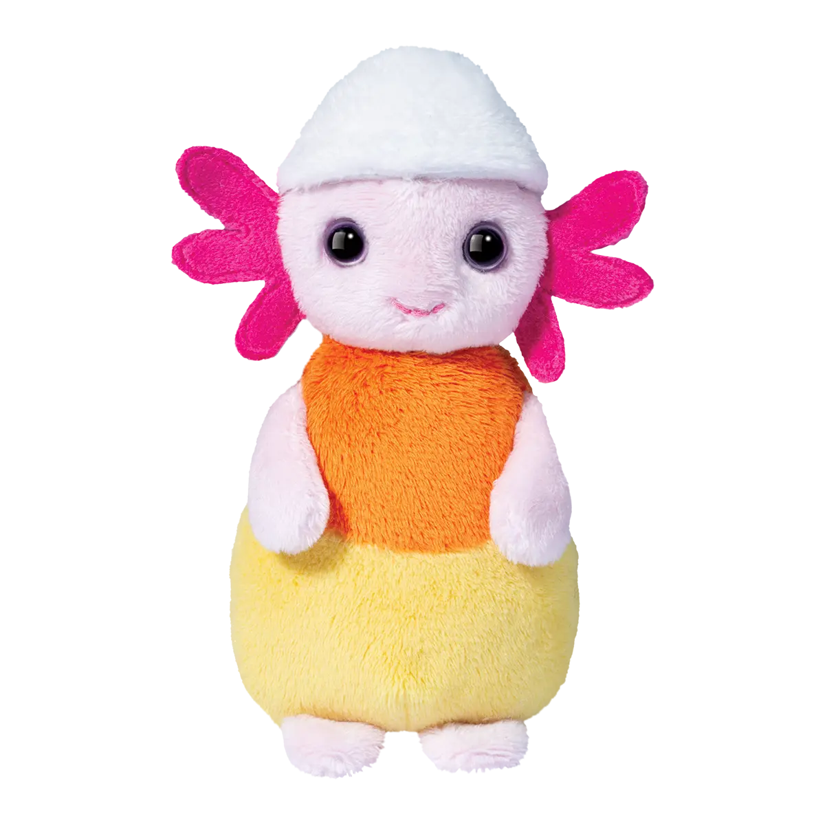 Candy Cornlotl’s orange and yellow candy corn body is soft and squishy, while her wide, friendly eyes and little stitched smile give her a cheerful and approachable vibe. The little white hat on top of her head completes her Halloween costume.