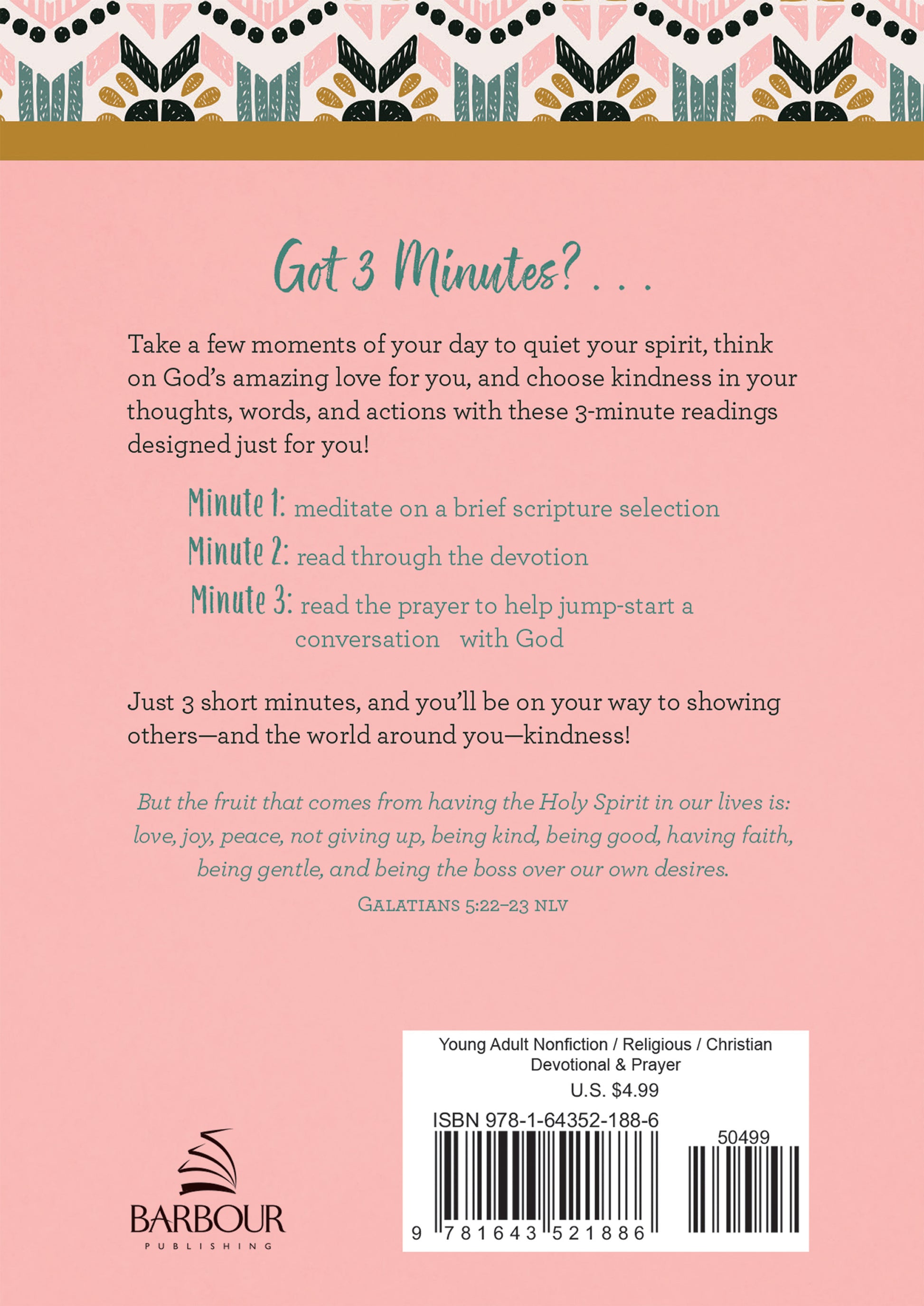 This delightful devotional that encourages teen girls, ages 13–18, to take a few moments of your day to quiet your spirit, think on God's amazing love for you, and to choose kindness in your thoughts, words, and actions. Dozens of just-right-sized readings pack a powerful dose of comfort, encouragement, and inspiration and are designed to meet teens right where you are in life. In only 3 short minutes, your heart will be on its way to showing others—and the bigger world around you—kindness!