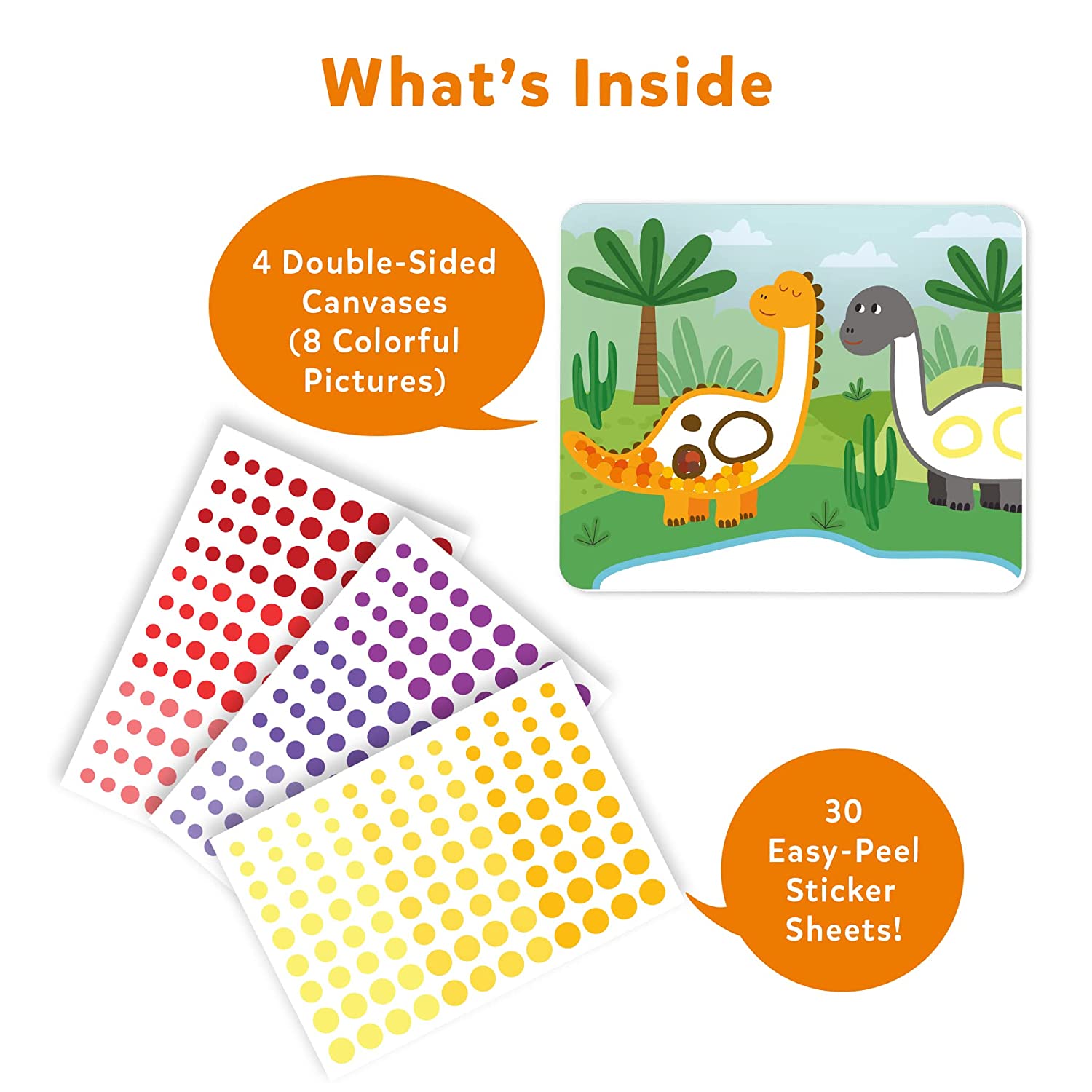 - WHAT'S INSIDE - 30 colored sticker sheets (500+ stickers), 4 double-sided canvases