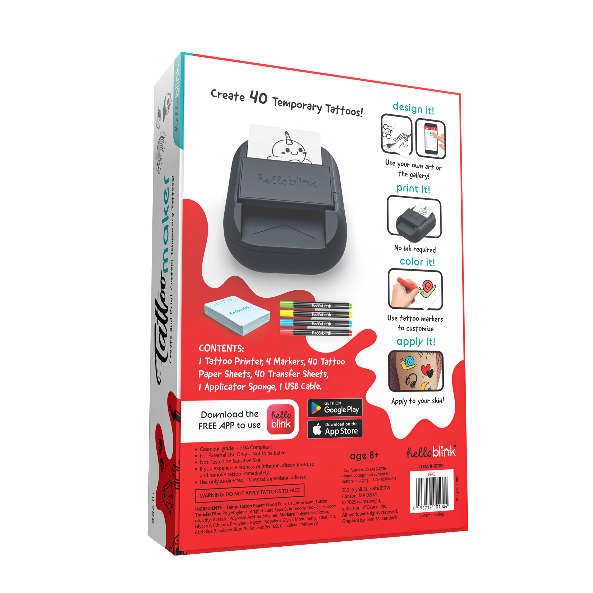 Let your creativity shine with the Hello Blink Tattoo Maker! The innovative Tattoo Maker allows kids aged 8 and up to design, print, and customize their own temporary tattoos. This ink-free thermal printer connects to the free Hello Blink app, where you can create unique tattoo designs, upload photos and images, or choose from our fun and varied gallery. Then, you can print your artwork onto the included Tattoo Paper, color your tattoos with the included tattoo markers, and then transfer them onto your skin—no mess, no ink required! Perfect for birthdays, sleepovers, school breaks, or crafting on the go, this set includes everything you need: the Hello Blink Tattoo Printer, 4 tattoo markers, 50 tattoo paper sheets, 50 transfer paper sheets, and a USB charger. Temporary tattoos are easy to apply and last about 24–72 hours. Removal instructions are included. Age 8+