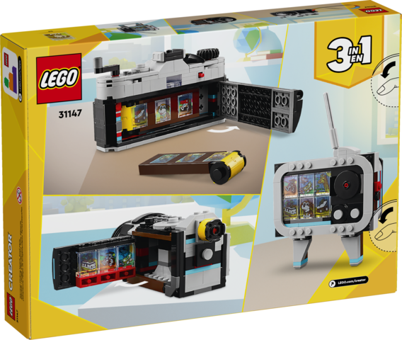 Build and rebuild 3 different pieces of vintage technology using the same set of bricks with this LEGO® Creator Retro Camera 3 in 1 toy Kids can dream up their own fun-filled stories with 3 different retro models: a camera toy, a video camera and a TV The camera toy has a moving lens, buttons to press, film to load in the back and a strap, while the video camera has an opening flap for filming and the TV has an antenna Ages 8+