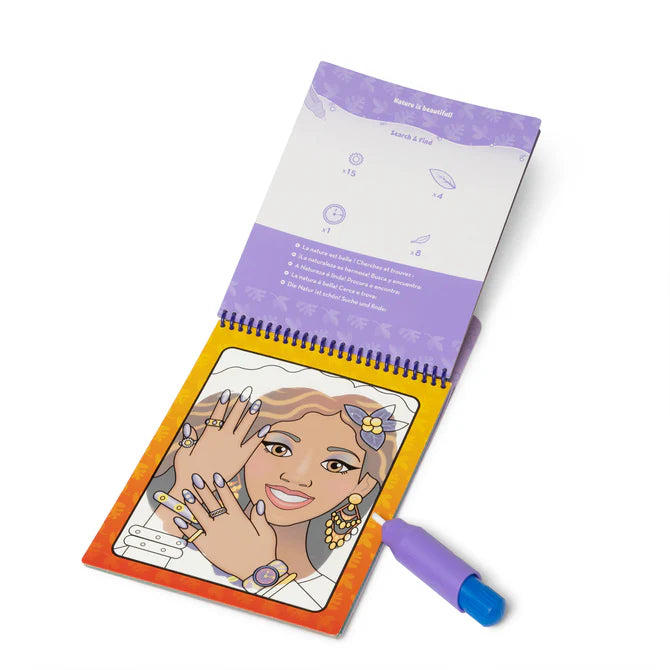 - Reusable pages are white with simple line drawings when dry; reveal colors when wet